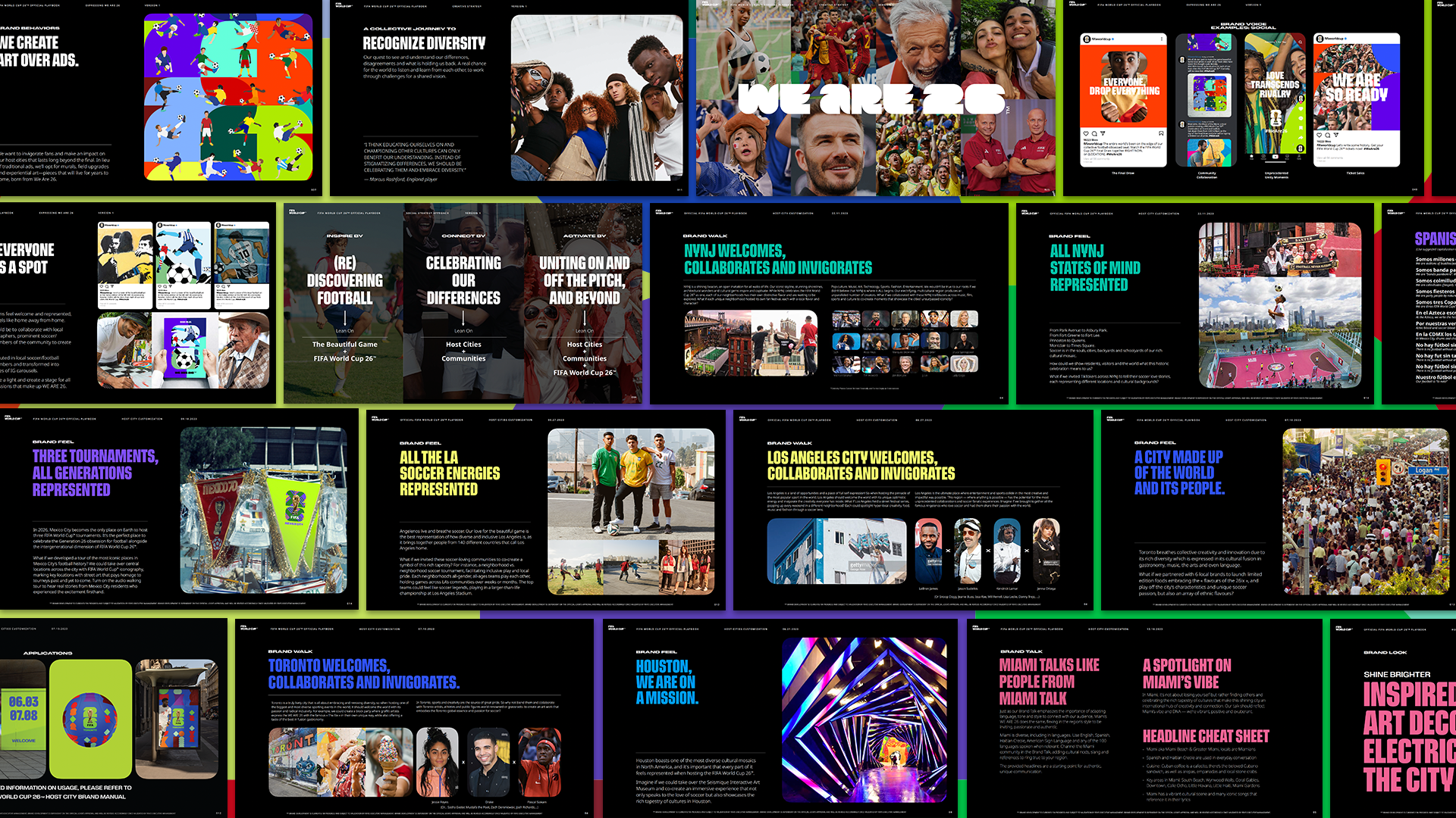 We collaborated with all 16 host cities to infuse their unique personalities and cultures into the tournament, shaping how the World Cup will be experienced locally and launching the brand on a global stage. As part of the brand development, we created 16 distinct brand books – comprehensive guides for how to activate the World Cup in each city before, during, and after the tournament.